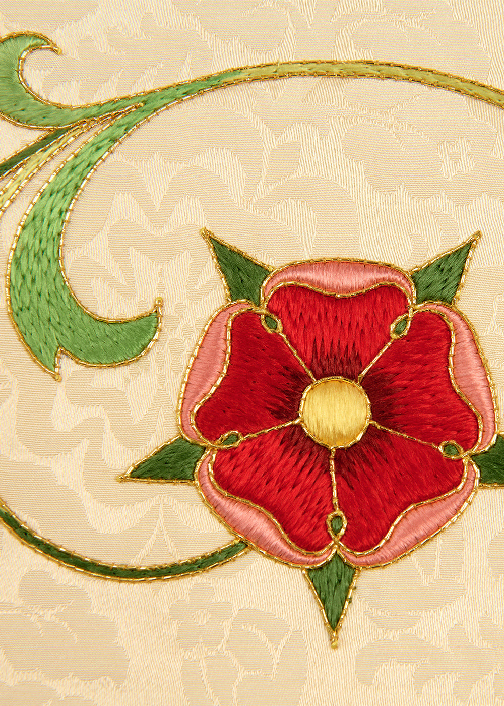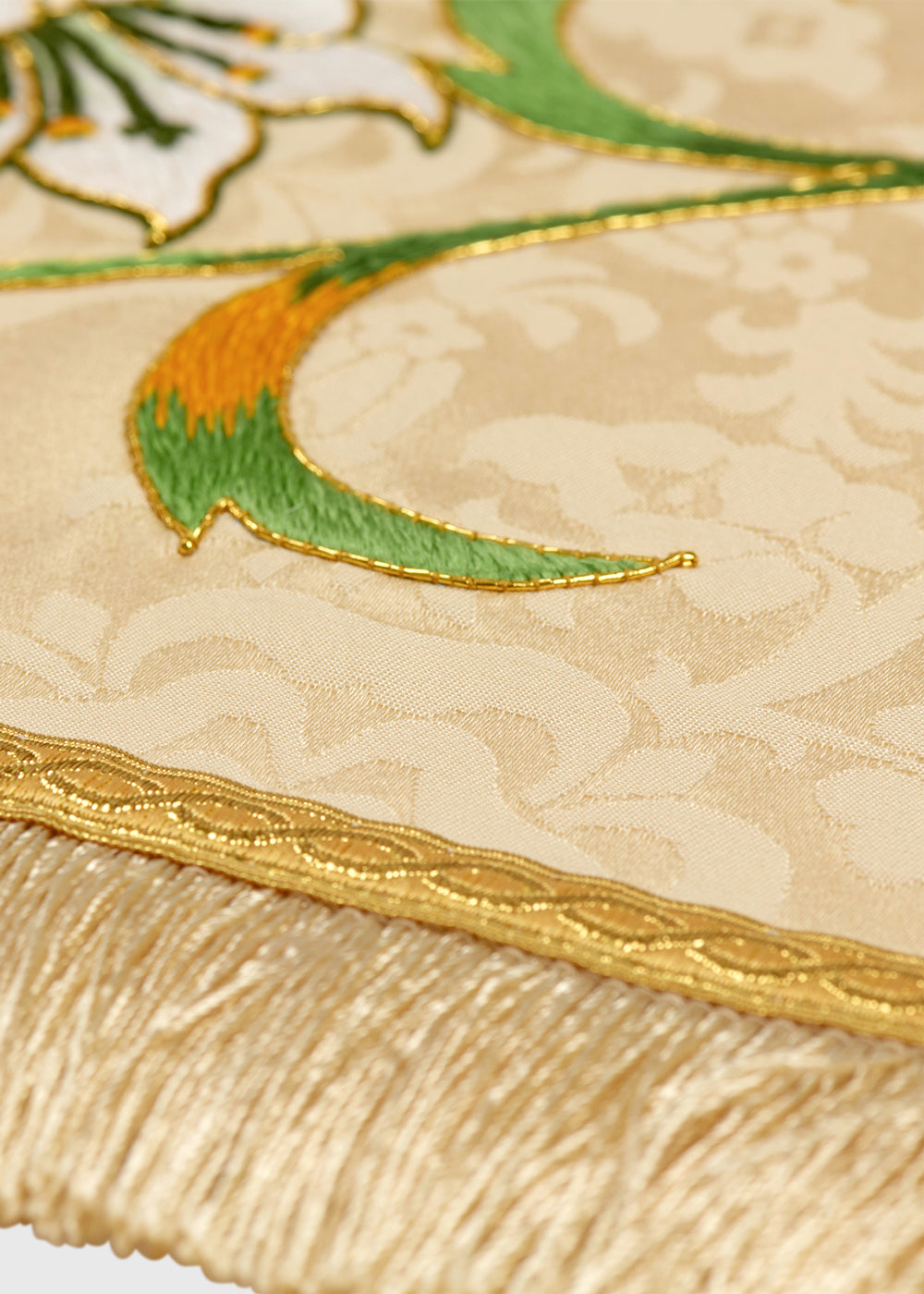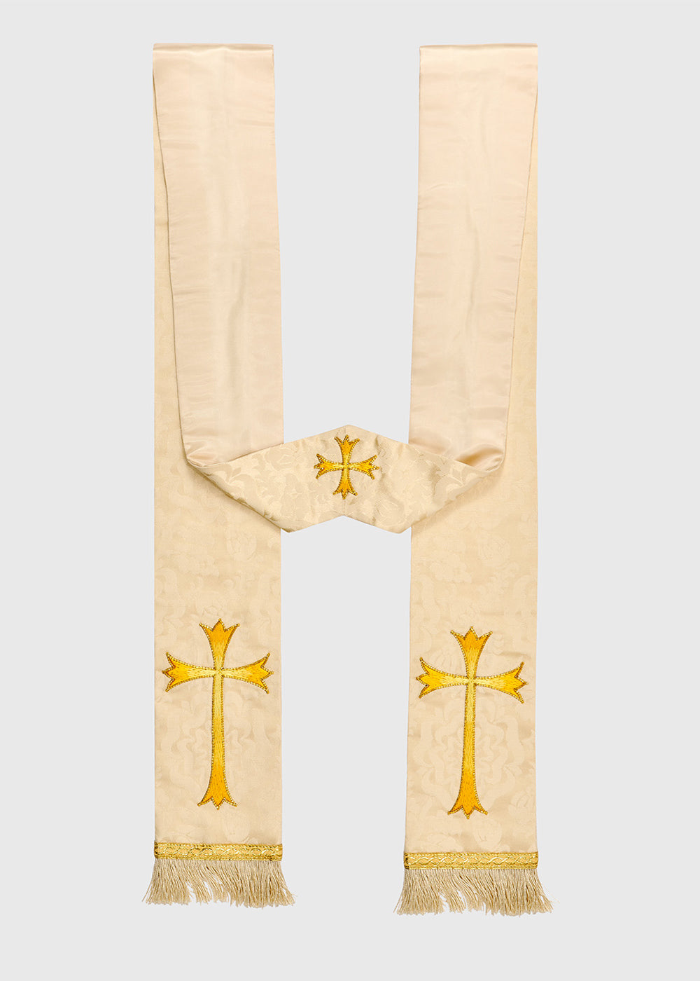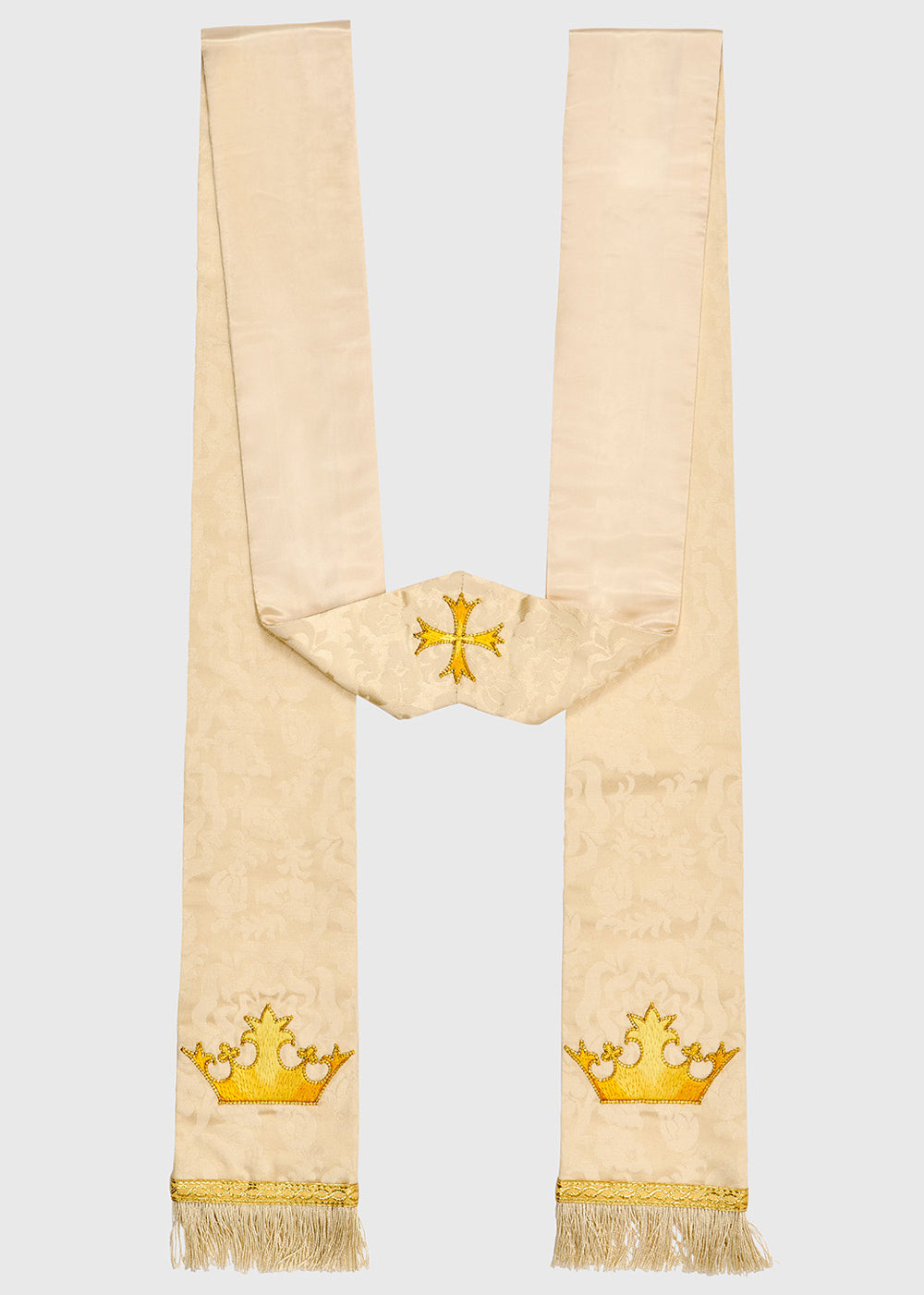 To coordinate with a new chasuble featuring restored embroidery, we crafted three new stoles: two with a hand-embroidered crown motif to match the chasuble, and one with a hand-embroidered cross. Each stole was custom-created to ensure the embroidery was indistinguishable from the original.
