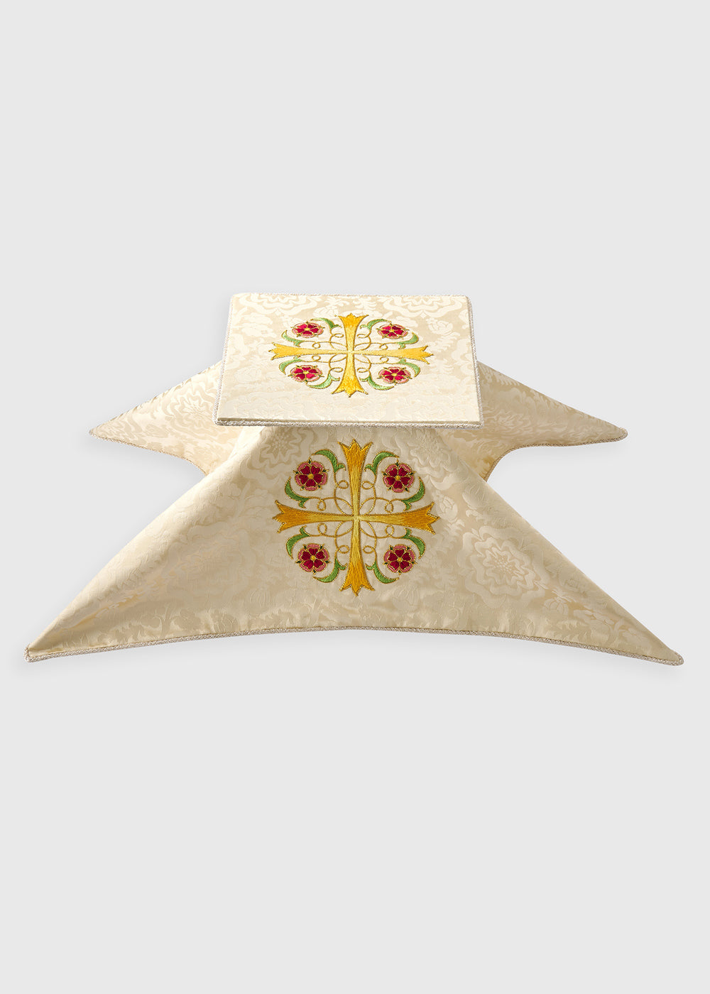 To accompany the altar frontal, we designed a new veil and burse centred around a cross motif to match the existing pieces. The embroidery on these items took an additional 26 hours, and a cream cord finishing around the edges ensured they aligned seamlessly with the current set.