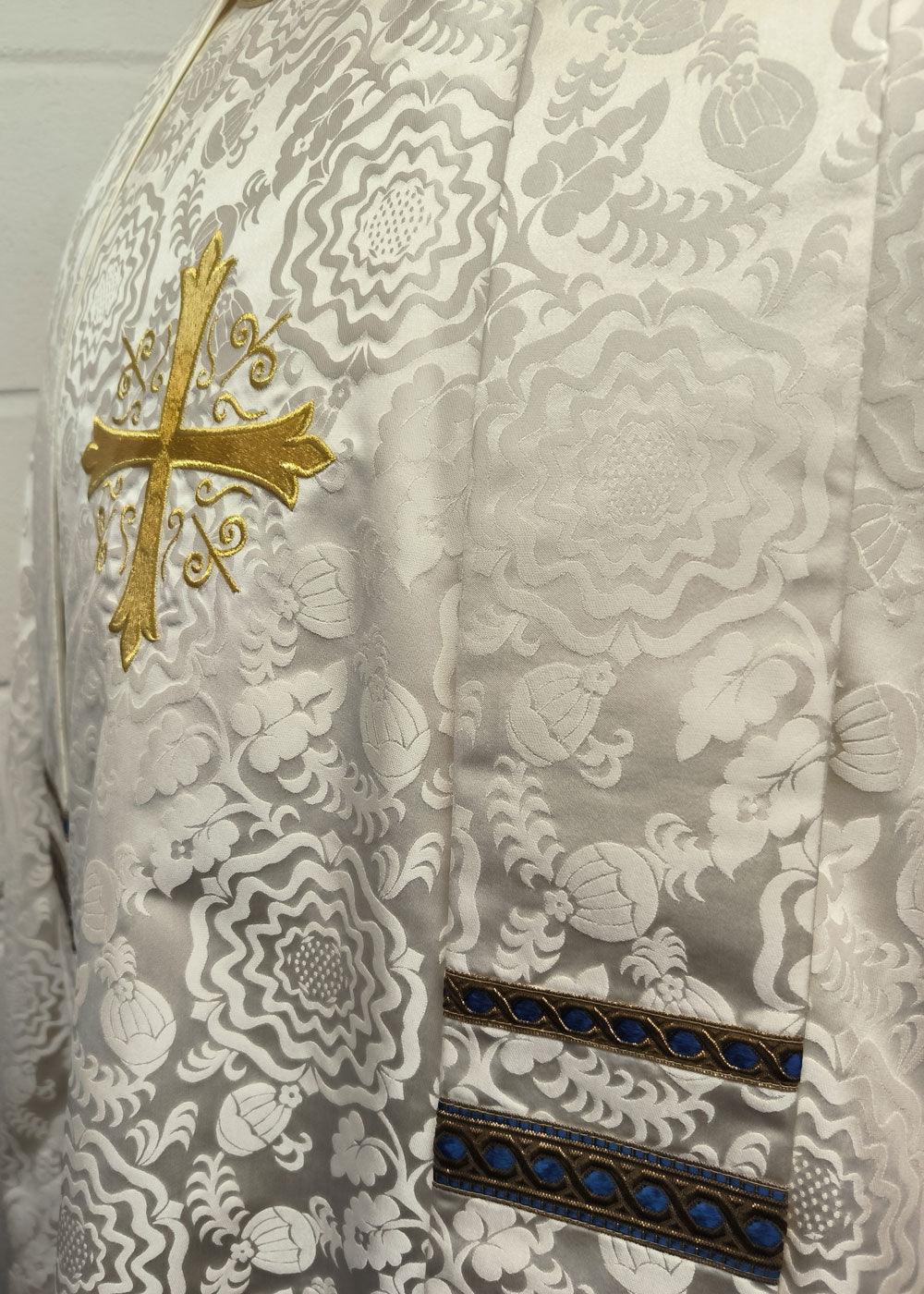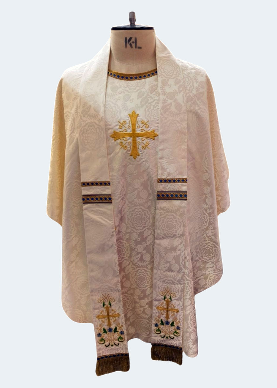 The chasuble pictured is in ivory Tudor rose fabric, featuring a machine-embroidered custom cross design on the back. The front displays a stunning gold lurex cross (Embroidery Design 2832), accented with blue and gold St. Benet braid around the neck. It is shown with a matching stole.