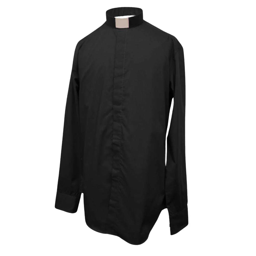 Black Classic Fit Clergy Shirt, Mens, Neckband Collar, Fly Front