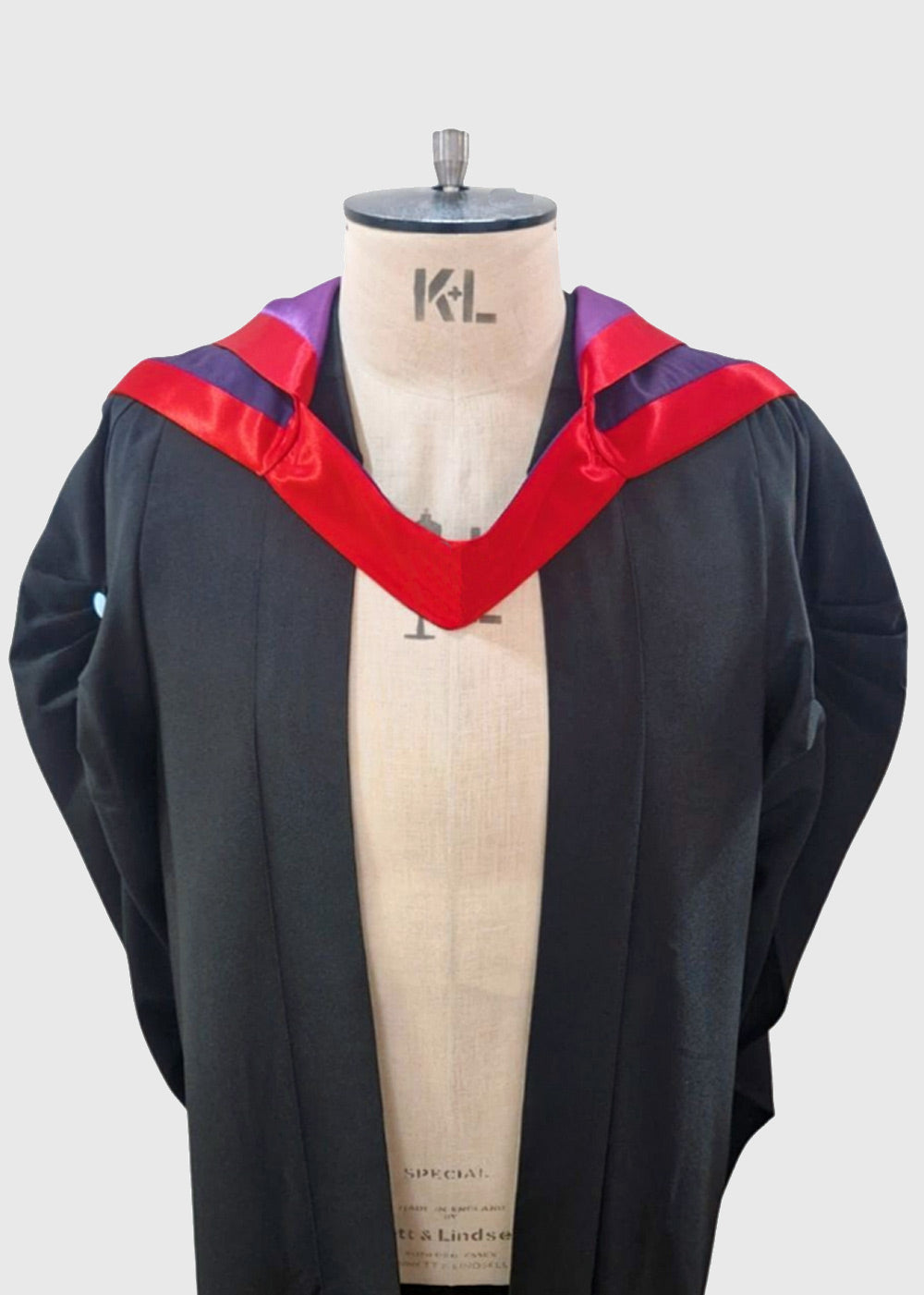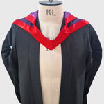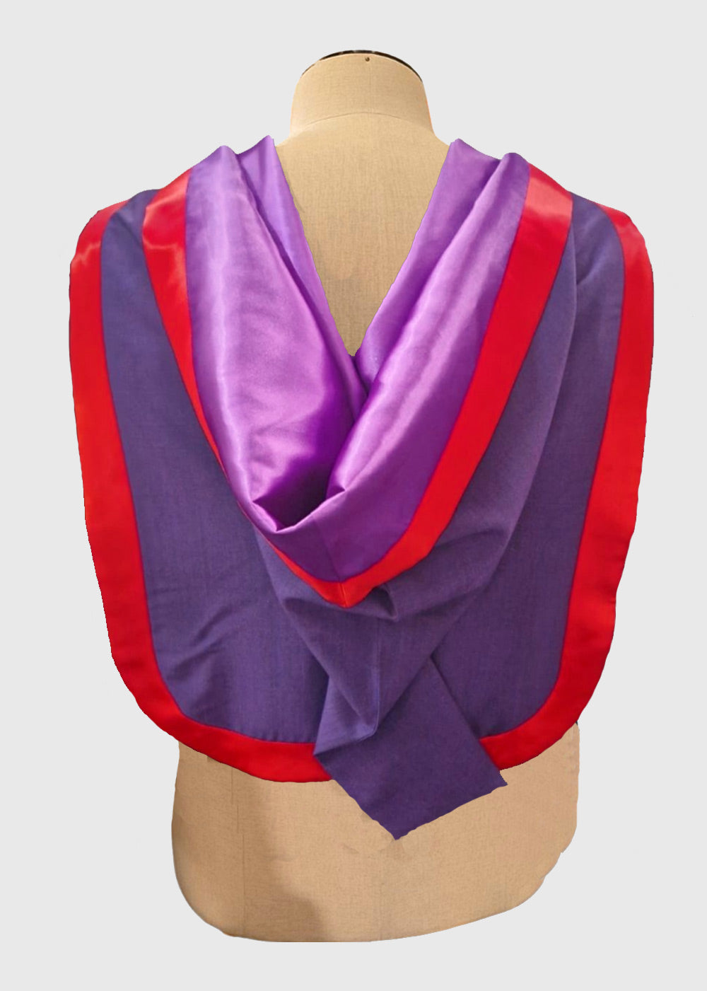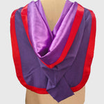 This dark purple Cambridge-shaped hood features a rounded dark purple cape fully lined with violet polyester silk, with the cape and cowl bound in College red silk. Made to meet Fellow of the College of Preceptors regulations as of September 2022. Illustrated in a purple wool and mohair.